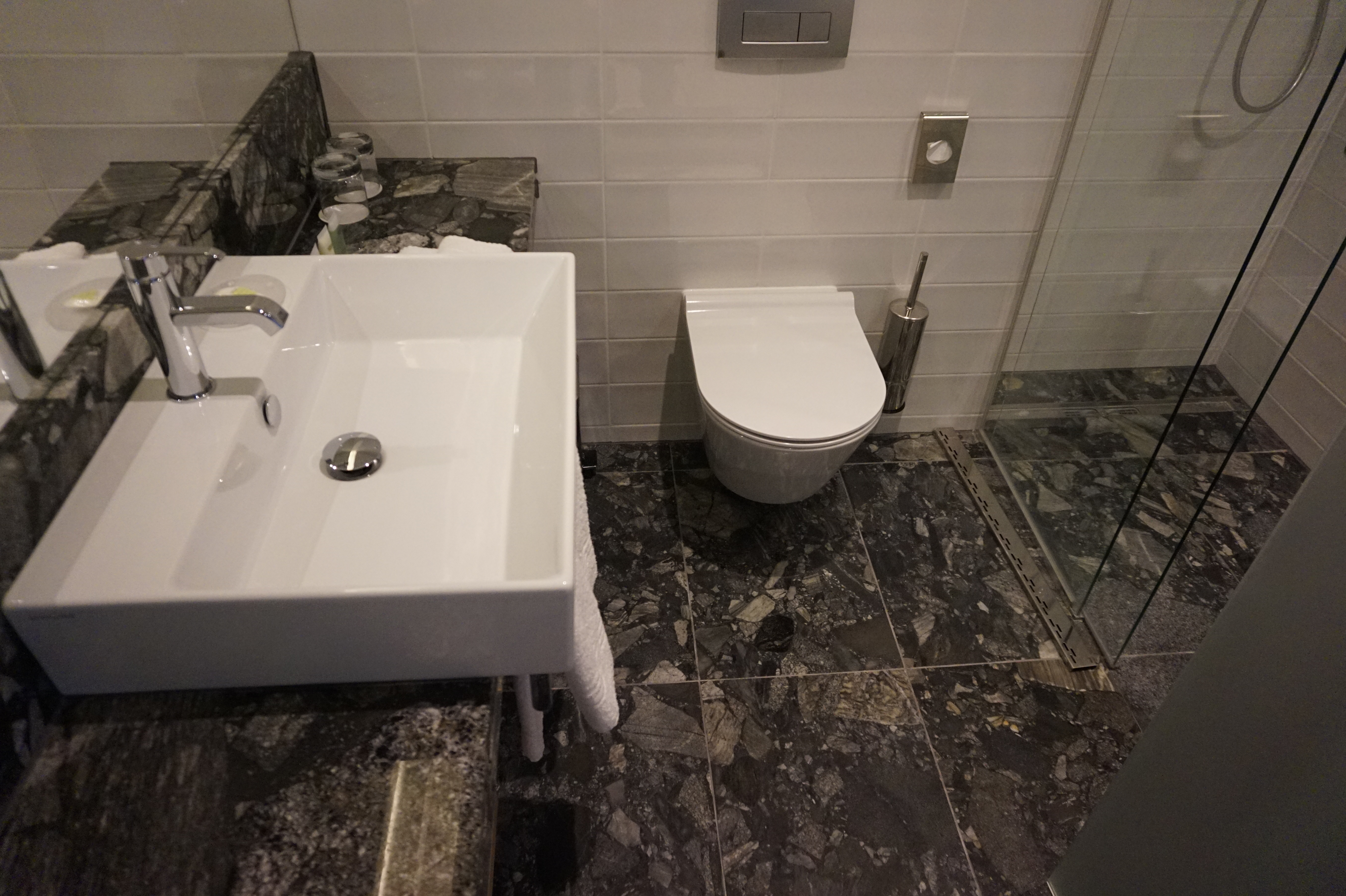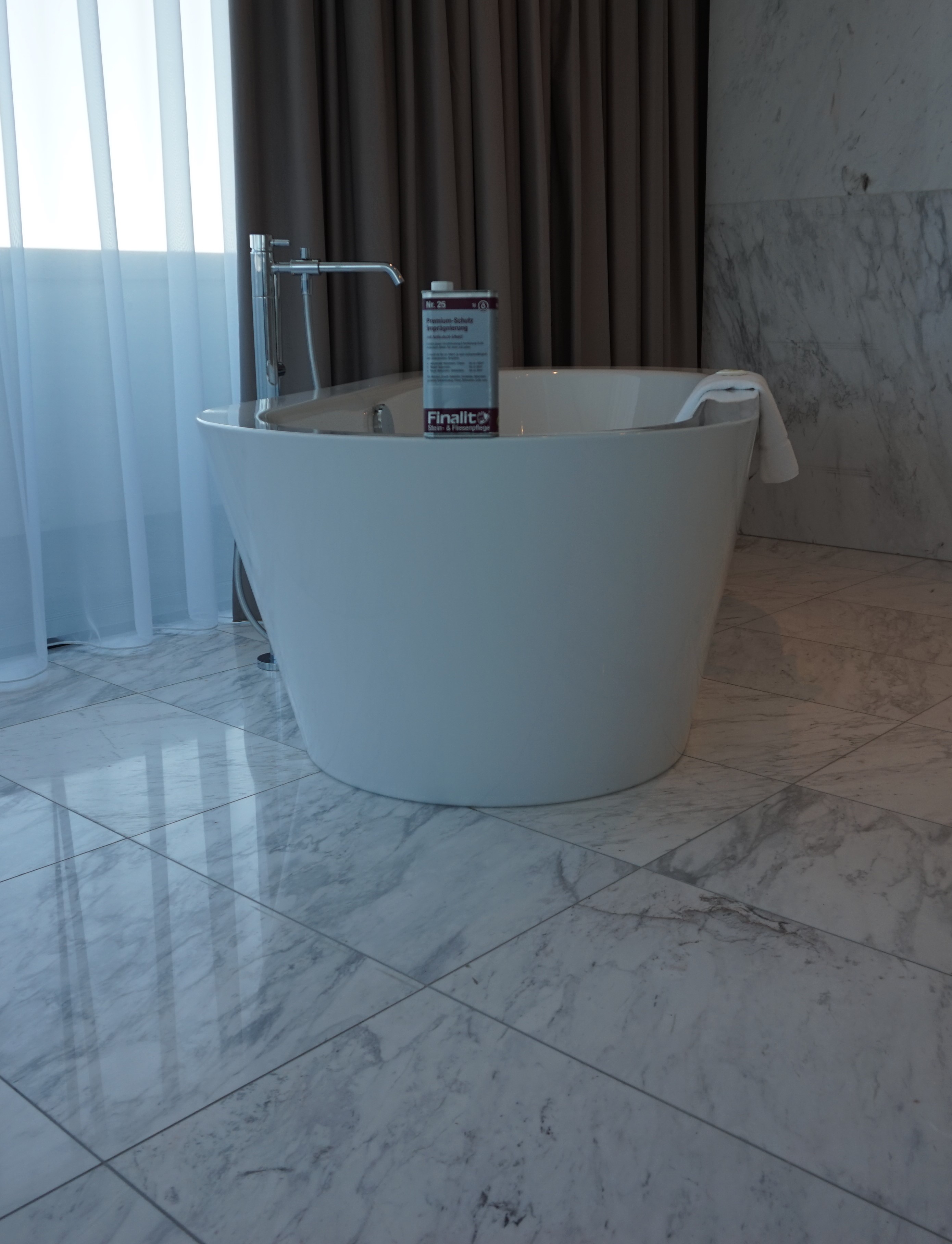 Kamenné povrchy jsou velmi krásné, ale každý kámen je porézní a bez správné a dlouhodobé impregnace je náročné udržet jeho bezvadný optický vzhled. V tomto případě bylo navíc potřeba aplikovat protiskluznou impregnaci do sprchových koutů.
