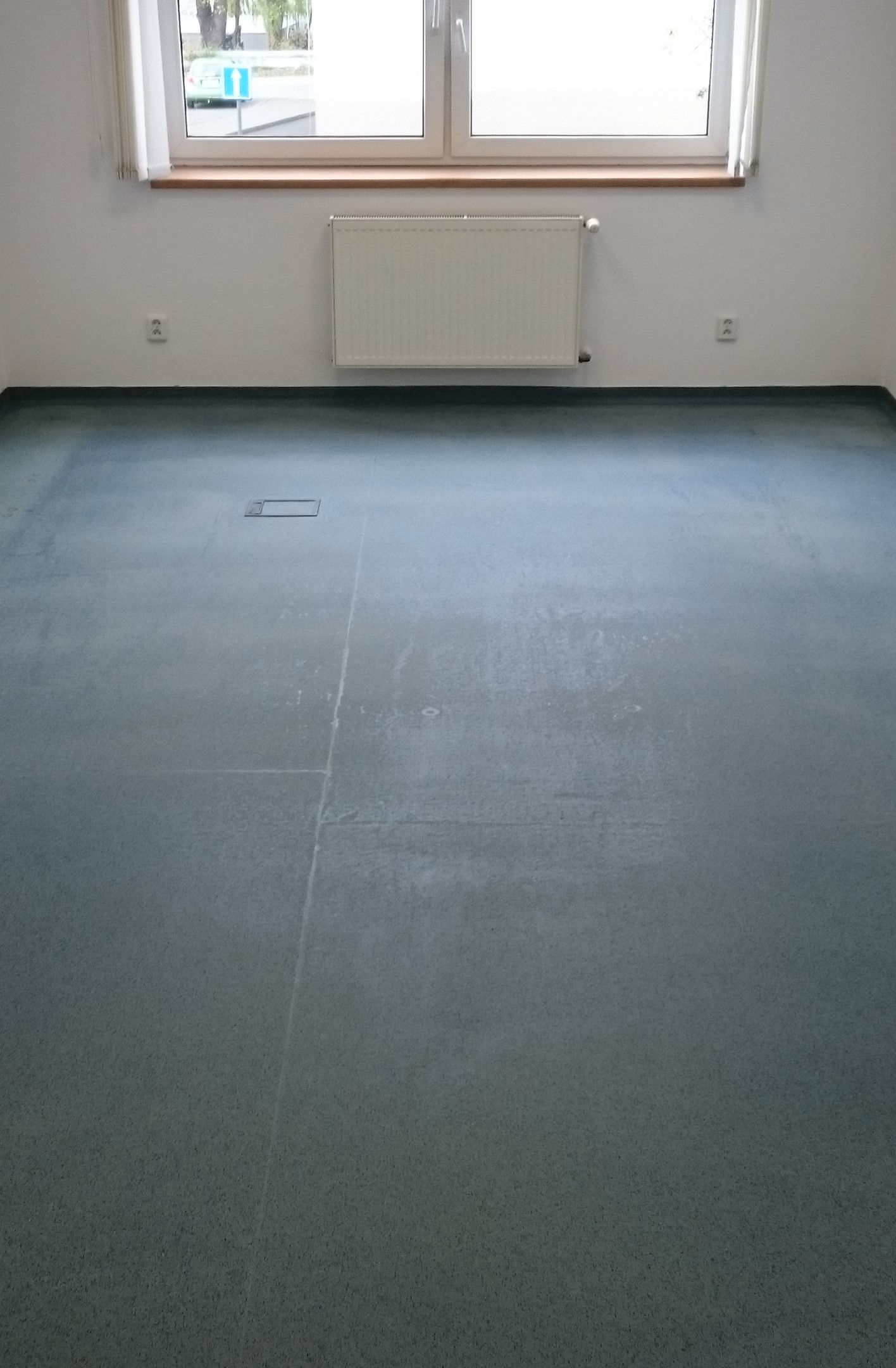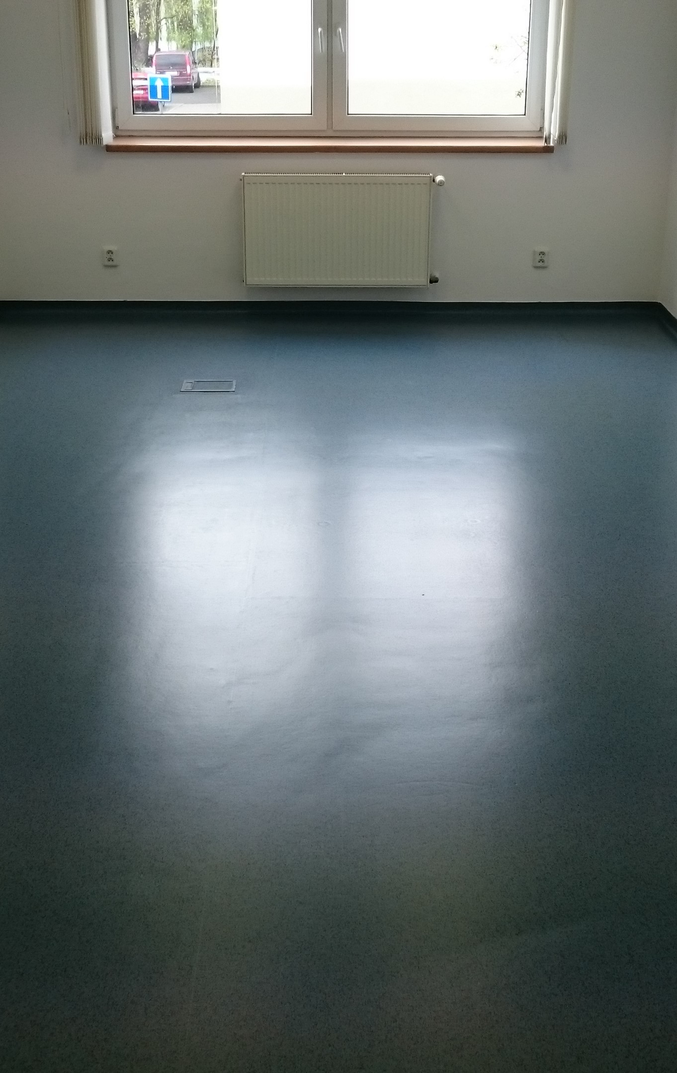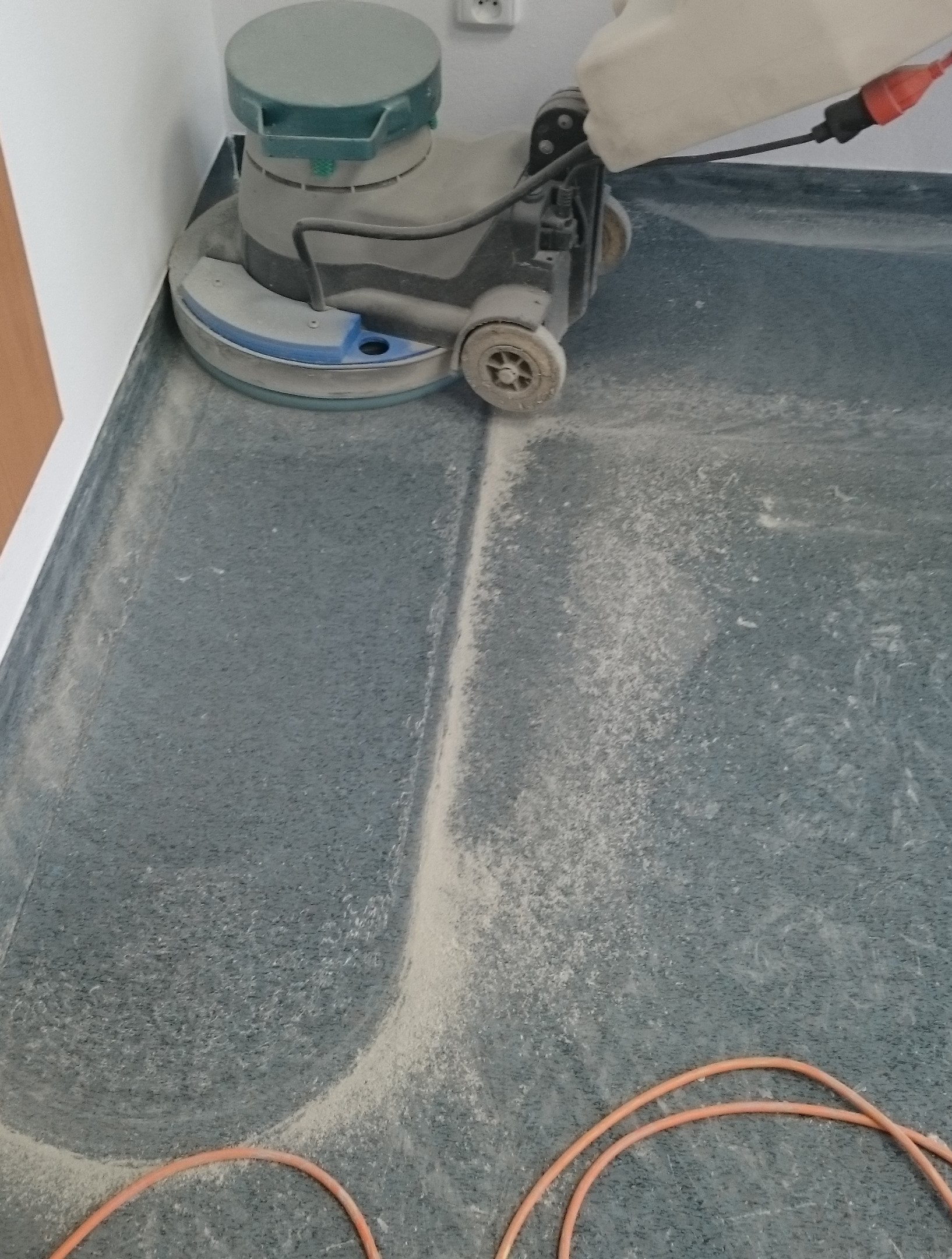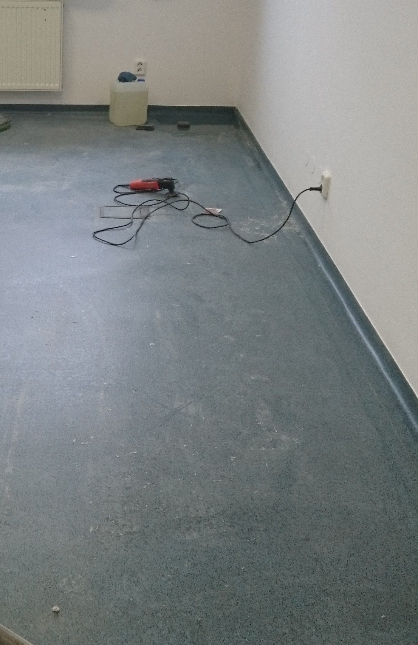 Když dva dělají totéž, tak to nikdy není totéž. Tady v tomto objektu se PU nátěry našim předchůdcům nepovedly. Příprava podkladu byla provedena špatně a původní polymerní vosky nebyly dobře chemicky odstraněny = nátěr špatně přilnul. Museli jsme pomocí diamantových padů původní nátěry odbrousit nejprve nasucho, pak ještě namokro. Vše muselo dolů až na surové linoleum. Pak jsme teprve mohli aplikovat nové nátěry PU ochranná vrstva.