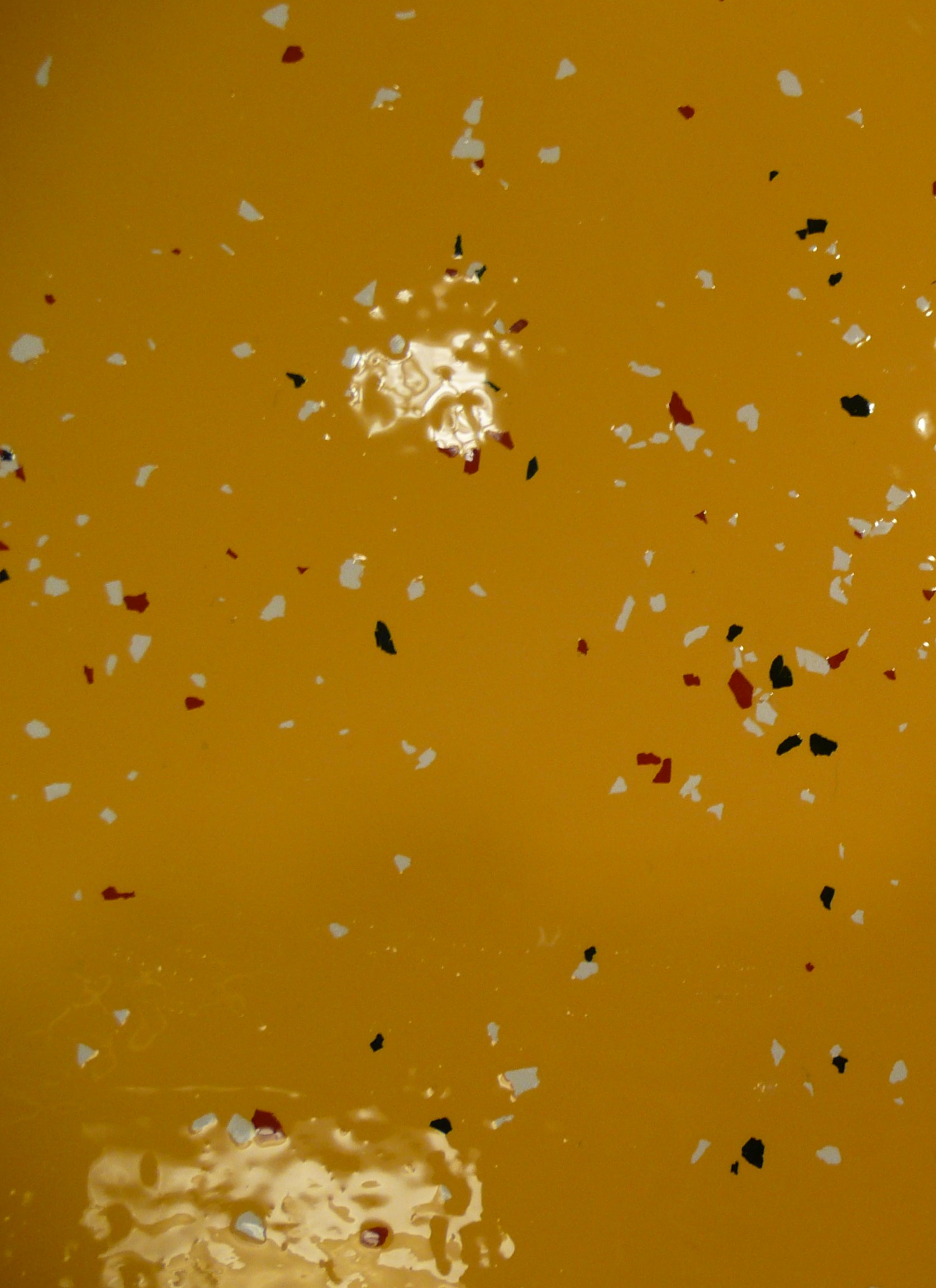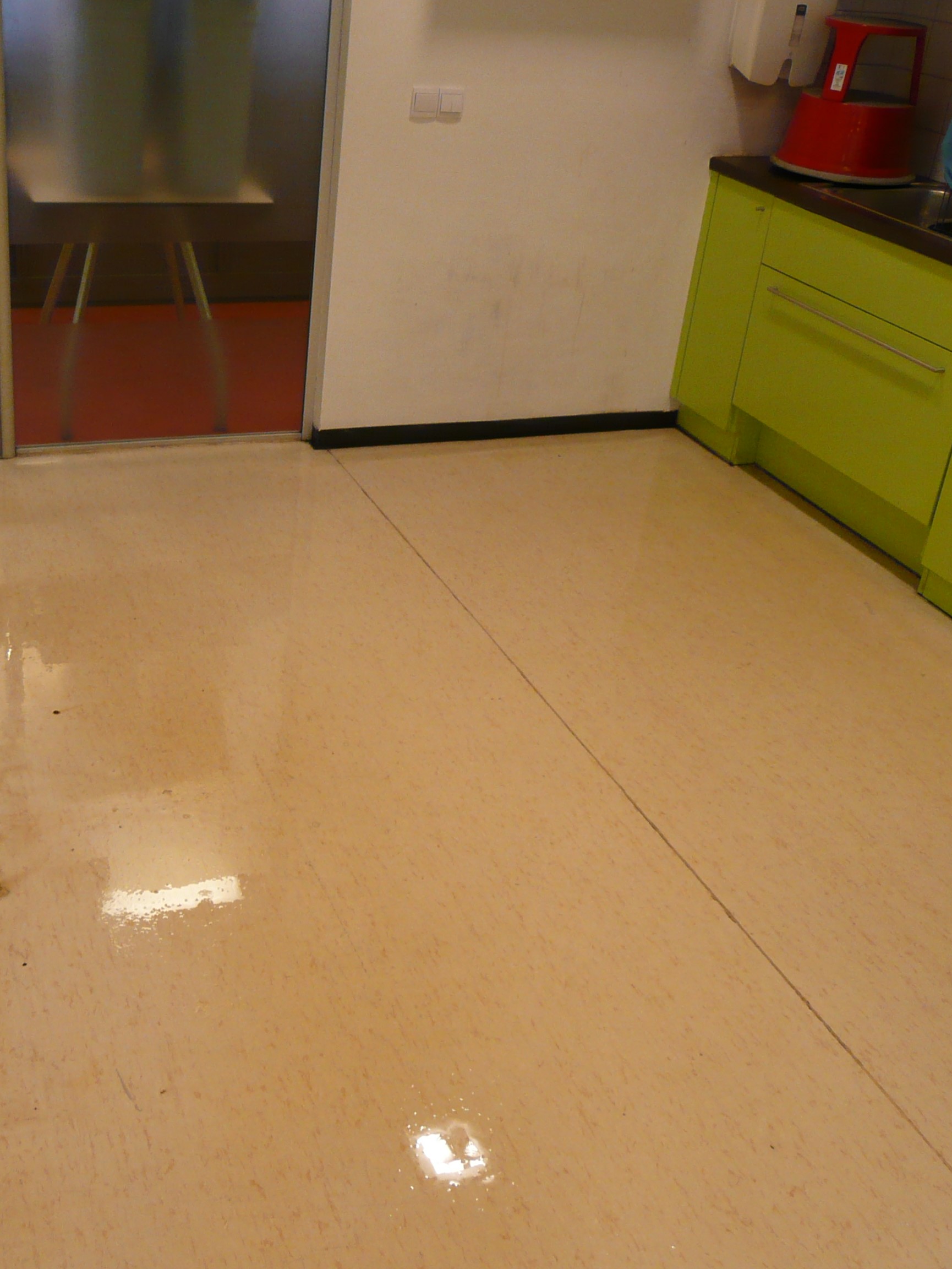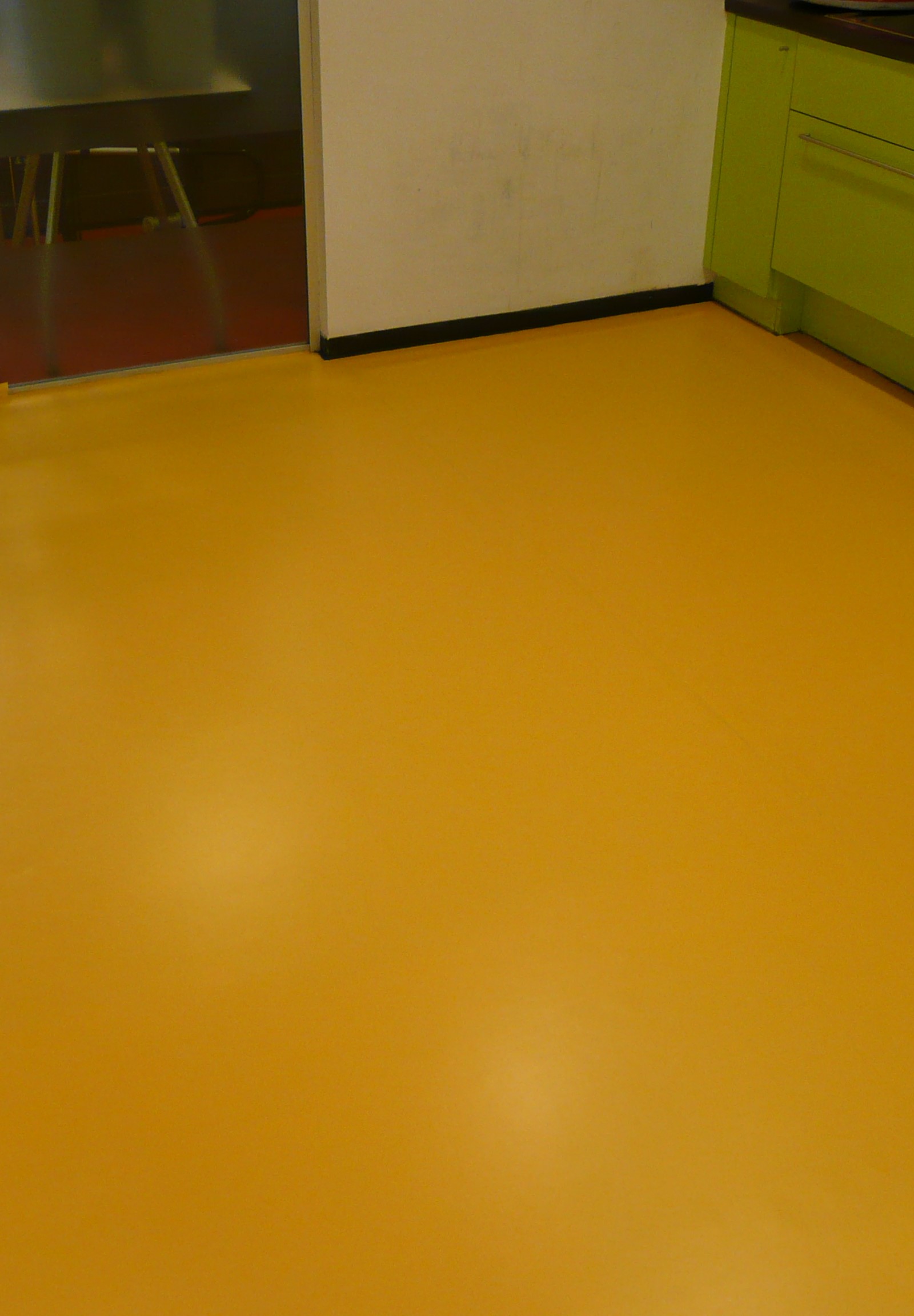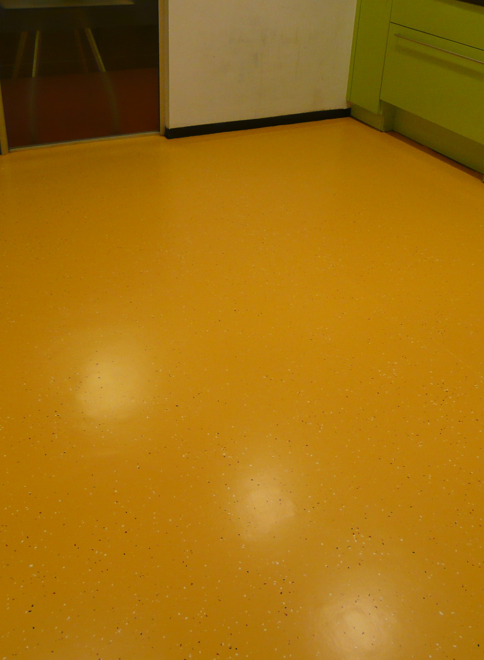 Někdy již renovace povrchu podlahy transparentním nátěrem nestačí a nebo chce klient změnu. V tomto případě to bylo obojí. Linoleum bylo naleptáno provozem v kuchyňce a zákazník chtěl zároveň něco nového. Povrch podlahy jsme vyčistili, připravili a poté byla aplikována barva Dr. Schutz PU Color, čipsy a krycí vrchní lak PU Anticolor.